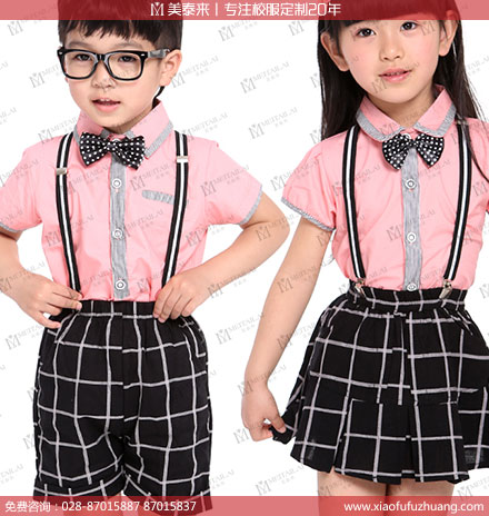 成都小学生校服定做新款活泼背带校服 粉红色可爱衬衫格子校服